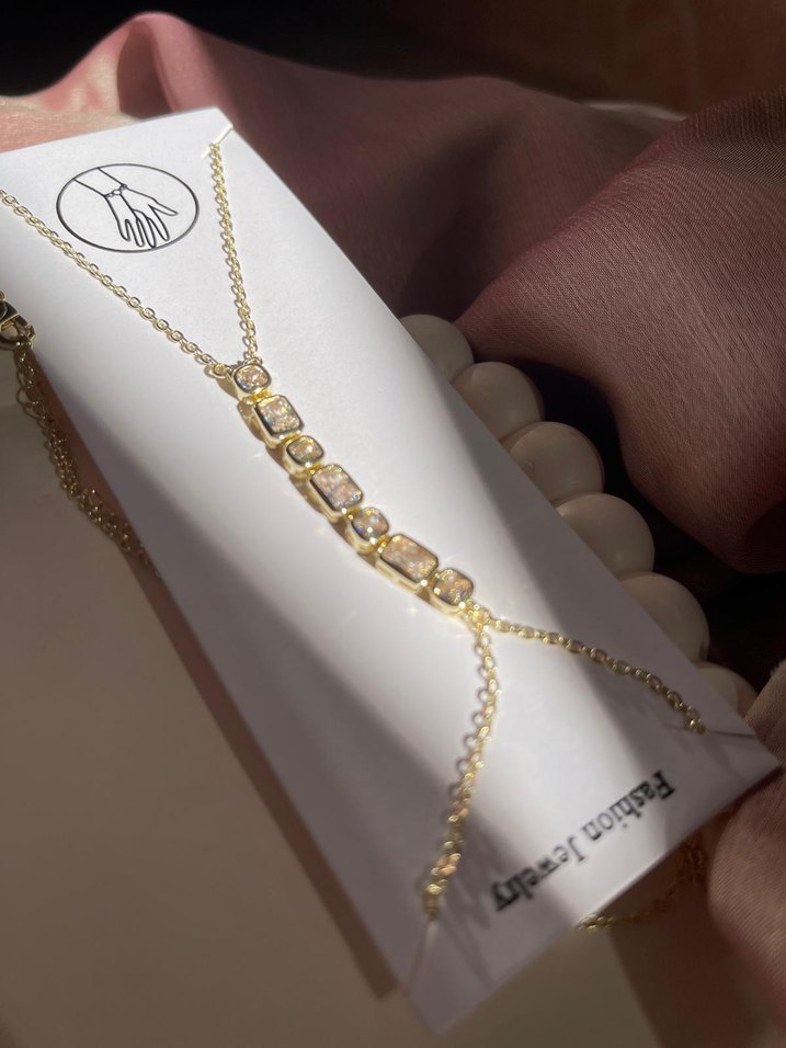 Zincir detaylı, taş baskılı açık altın rengi kadın el zinciri, romantik akşamlar için klasik şıklık sunar. ✨