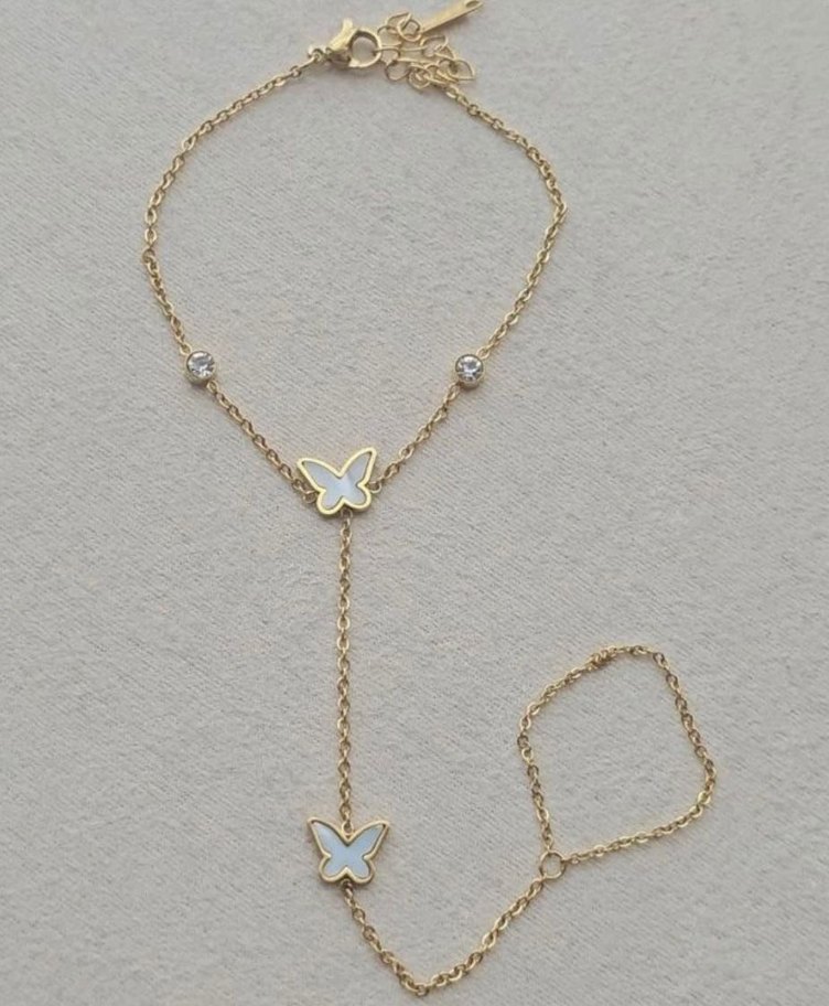 Altın renginde, işleme kelebek detaylı ince zincirli kadın el zinciri. Minimalist ve bohem tarzı günlük kullanıma uygun.çeliktir kararma yapmaz