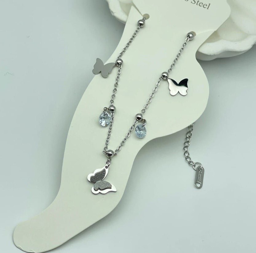 Çelikten yapılmış, kelebek ve küçük kristal detaylı, günlük kullanıma uygun minimalist ve çağdaş kadın el zinciri.
