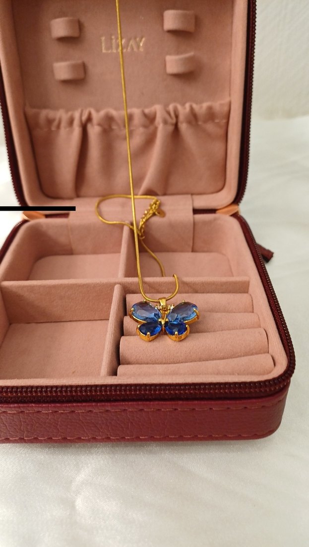 Çelik Zincir Detaylı Mavi Kelebek Kolye