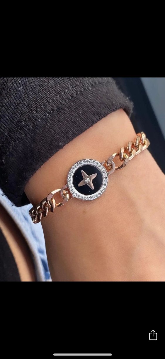 Zincir detaylı, parlak altın renkli bileklik, ortasında işlemeli yıldız ve küçük kristallerle süslenmiştir. Günlük rahat ve şık kullanıma uygundur. ✨