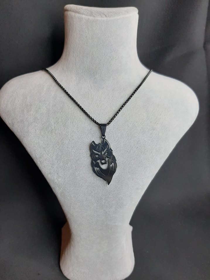 Çelik zincirli siyah gotik kolye, kurt figürlü çelik ucu ile rock punk tarzını yansıtır, günlük kullanıma uygundur.