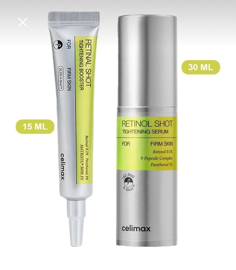 Celimax Retinol Shot Sıkılaştırıcı Serum, retinol %0.1, panthenol ve 9 peptit kompleksi içerir, cildi sıkılaştırmaya yardımcı olur. 15 ml ve 30 ml seçenekleri mevcut.