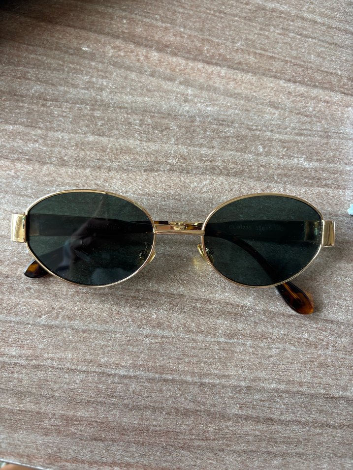 Altın renk çerçeveli, oval gri camlı ve kürk detaylı kol uçlarına sahip kadın güneş gözlüğü. Klasik zarafet ve karşı kültür tarzını birleştirir. ️