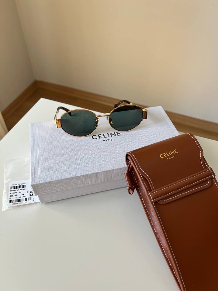CELINE kahverengi güneş gözlüğü, parlak yüzey ve tokalı detaylarla klasik zarafeti yansıtıyor. Yanında uyumlu kahverengi kılıf bulunur. ️