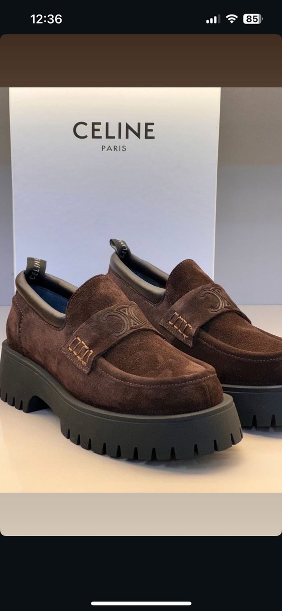 Celine markalı kahverengi süet kadın loafer, platform topuklu ve tokalı detaylıdır. Günlük sokak stiline uygundur.