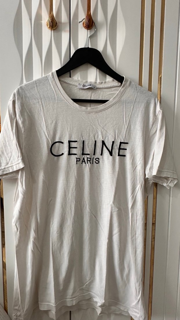 Beyaz keten kumaştan, bol kesim, kısa kollu ve yuvarlak yakalı tişört. Önünde "CELINE PARIS" baskısı bulunur, günlük sokak stili için uygundur.