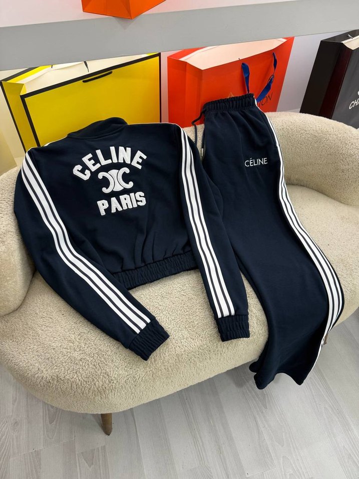 Celine markalı, siyah kadın eşofman takımı, uzun kollu ve bisiklet yaka detaylıdır. Yumuşak kumaştan üretilmiş, baskılı ve cırt cırt özelliklidir. Spor şıklığı için uygundur.