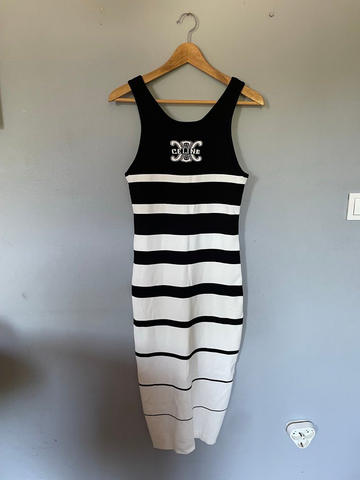 Orijinaldir, sorunu veya defosu yoktur. Celine imzası taşıyan bu özel tasarım elbiseyle tanışın! Siyah ve beyazın zamansız uyumunu modern çizgilerle buluşturan bu elbise, gardırobunuzun en gözde parçası olmaya aday. Göğüs kısmındaki ikonik Celine logosu, kaliteyi ve stili bir arada sunarken, vücudu saran fitilli kesimiyle hem rahat hem de son derece şık bir görünüm sağlıyor. İster spor ayakkabılarla gündüz şıklığını yakala, ister topuklularla iddialı bir akşam kombini yap.