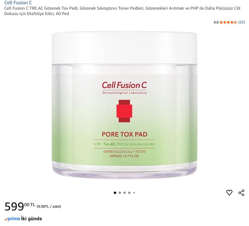 Elimdeki ürün fazlalığından satıyorum. Skt 2027. Cell Fusion C gözenek sıkılaştırıcı toner pedleri, gözenekleri azaltır ve pH dengesini sağlar. 60 ped içerir, dermatolojik olarak test edilmiştir.