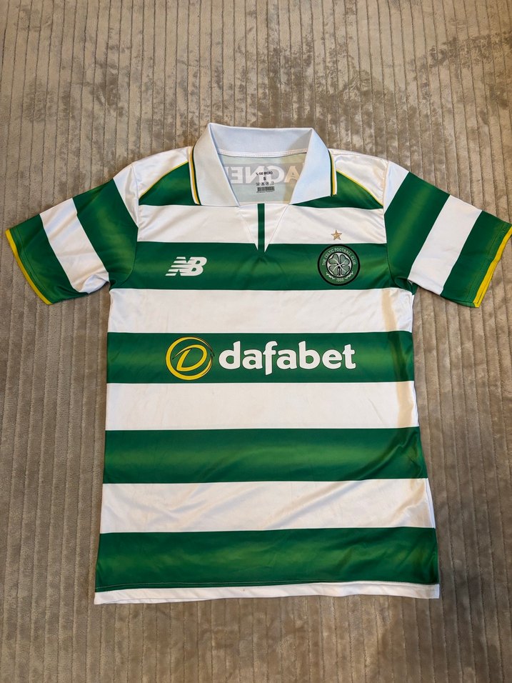 A kalite Celtic forma sorunsuz S beden Kısa kollu, yuvarlak yakalı, yeşil beyaz çizgili ve düğmeli erkek forma. Sentetik kumaş kullanılmış, önünde 'dafabet' baskısı bulunur.