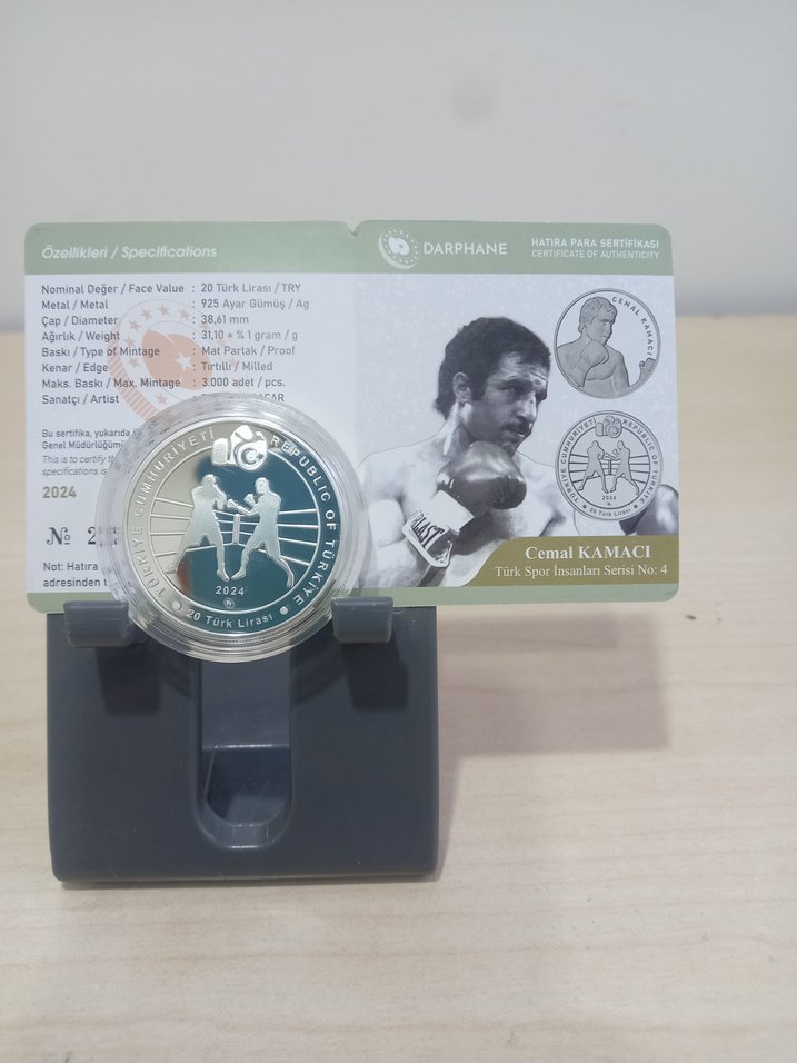 2024 tarihli Çemal Kamacı hatıra gümüş madeni para, 20 Türk Lirası değerindedir ve orijinallik sertifikalıdır. Gri stand ve altın detaylarla sunulmuştur.