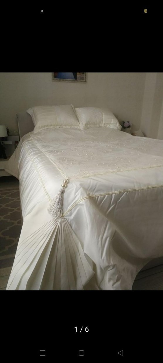 Parlak işlemeli detaylar ve dekoratif püsküllerle süslenmiş beyaz yatak örtüsü, yatak odanıza şıklık katar. ✨ Temiz çantası ile birlikte gönderilecektir fazlalık