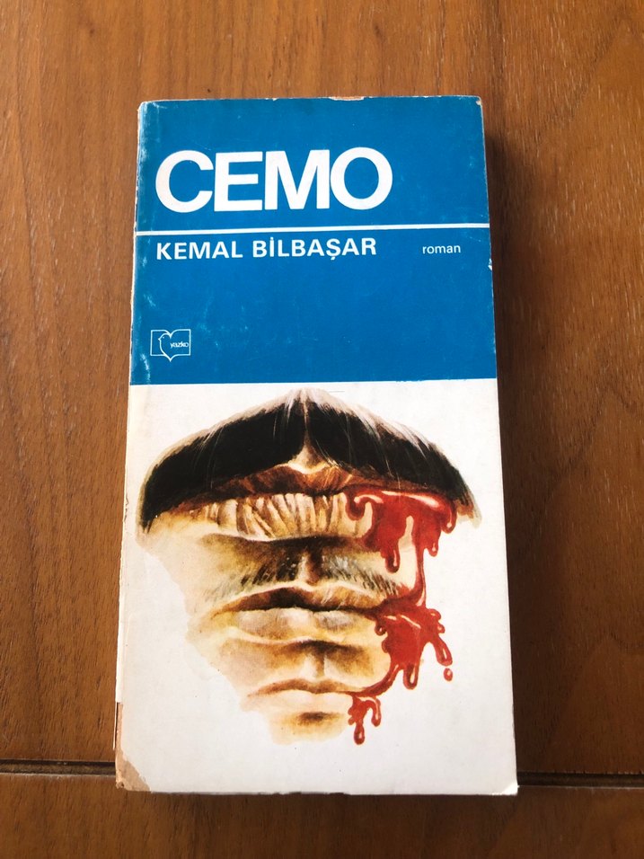 Kemal Bilbaşar'ın "Cemo" adlı romanı, bıyık ve akan kırmızı boya detaylı dikkat çekici kapağa sahip.
