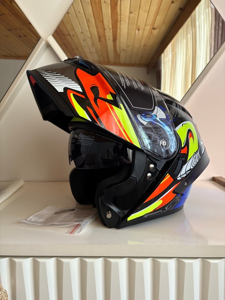 Renkli baskılı desenlere sahip, kayışlı ve dayanıklı karbon malzemeden motosiklet kaskı. Avant-garde ve rock punk havasında.