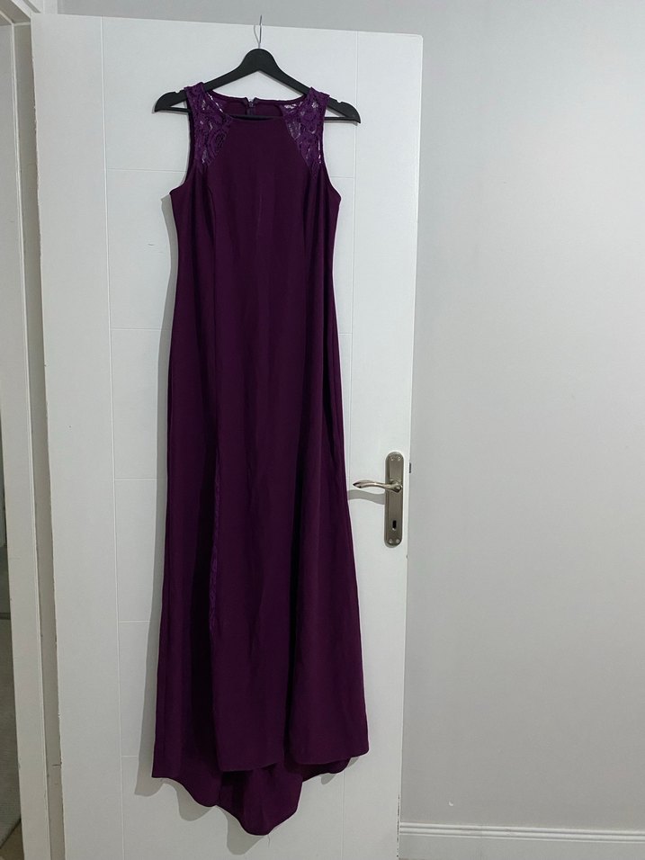 Koyu mor renkli, kolsuz, yüksek yakalı ve drapeli detaylara sahip, düğünler için ideal uzun ve vücuda oturan klasik abiye elbise.
