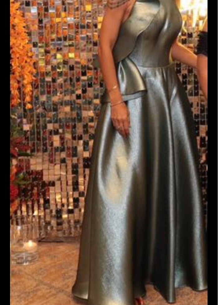 Sırt dekoltesi,sağ omzunda volanlı süsü ve kendi sütyeni var. Kendinden parlak kumaş,ışık vurunca rengi 3. fotoğraftaki gibi.1 kere kullanıldı. İade kabul edilmemektedir.