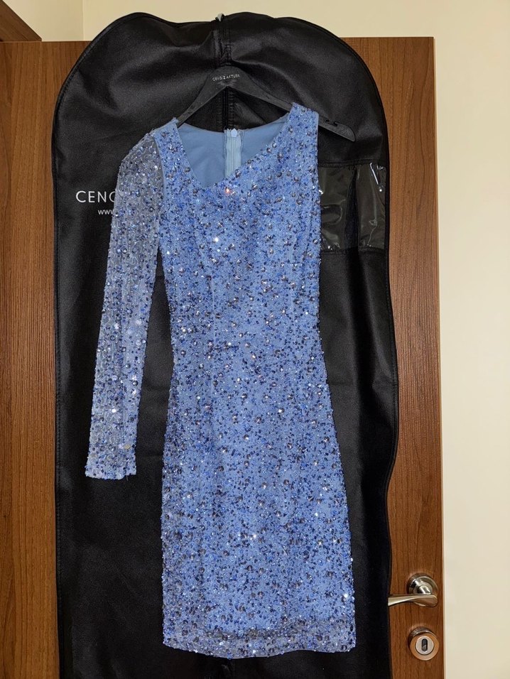 Drapeli ve baskılı desenli mavi tonlarda, vücuda oturan midi elbise. CENGİZ AKTÜRK markasına ait, romantik akşamlar için uygun. Bir defa kullanıldı