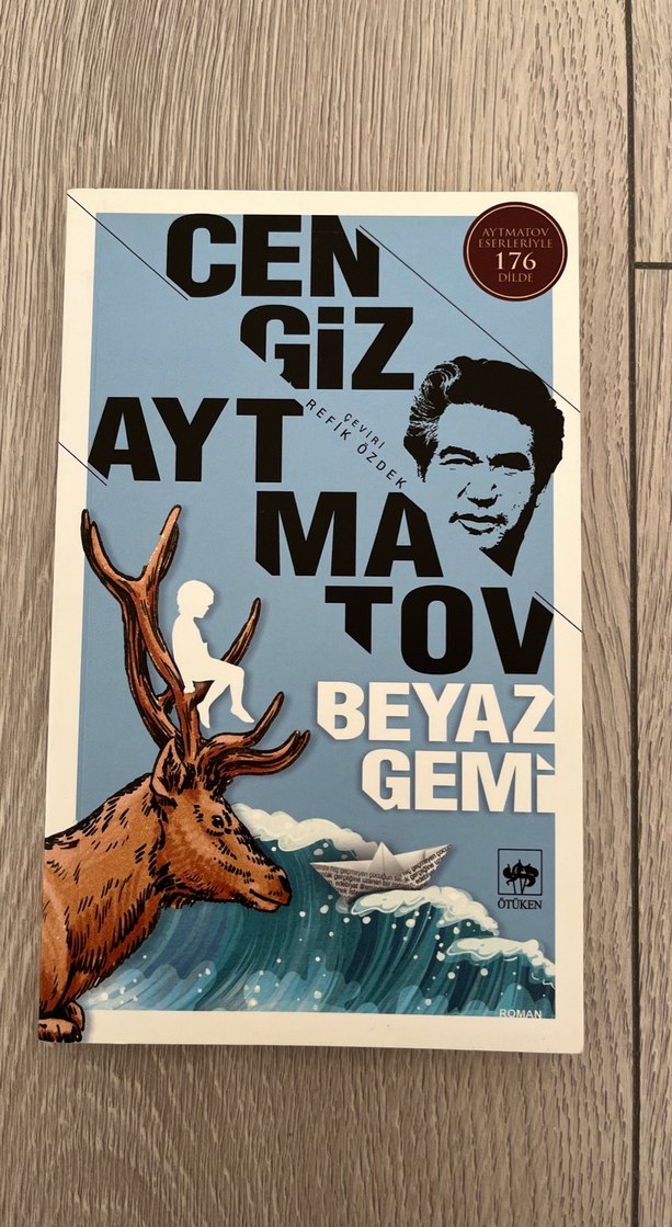 Cengiz Aytmatov'un "Beyaz Gemi" adlı romanı, geyik, dalga ve kağıt gemi görselleriyle kaplanmıştır. Kitap 176 sayfadır.