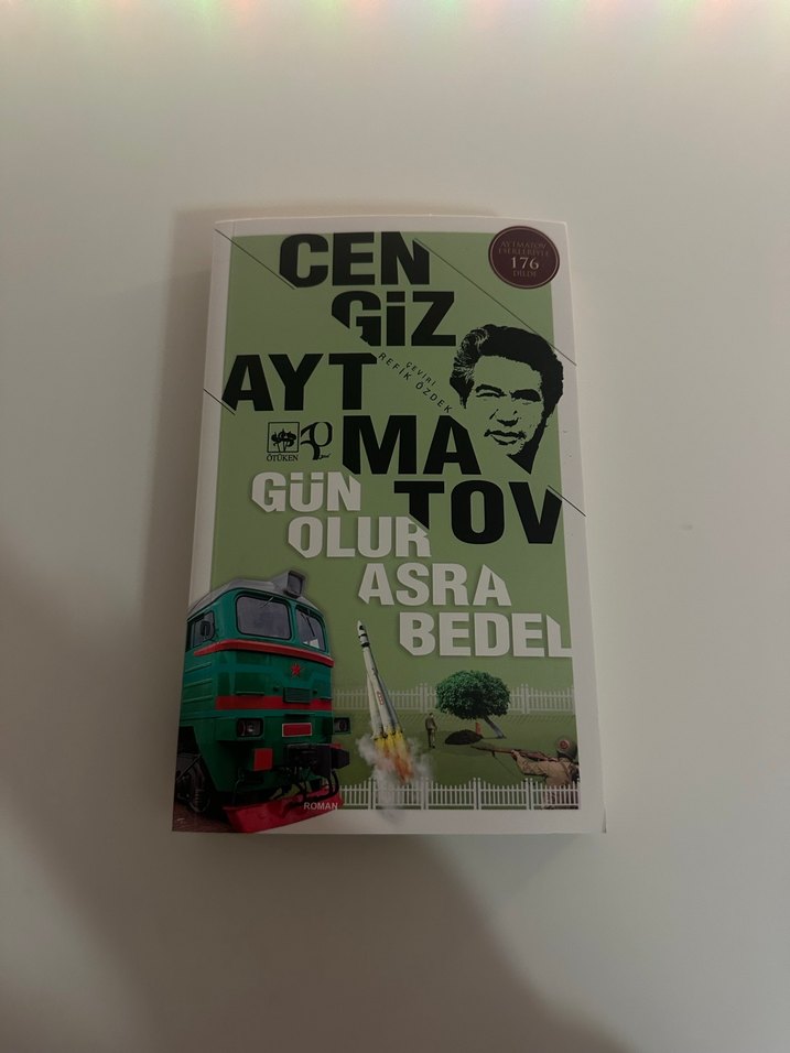 Cengiz Aytmatov'un "Gün Olur Asra Bedel" adlı romanı, derin temaları etkileyici bir anlatımla işler. Kapakta tren ve roket görseli bulunuyor.