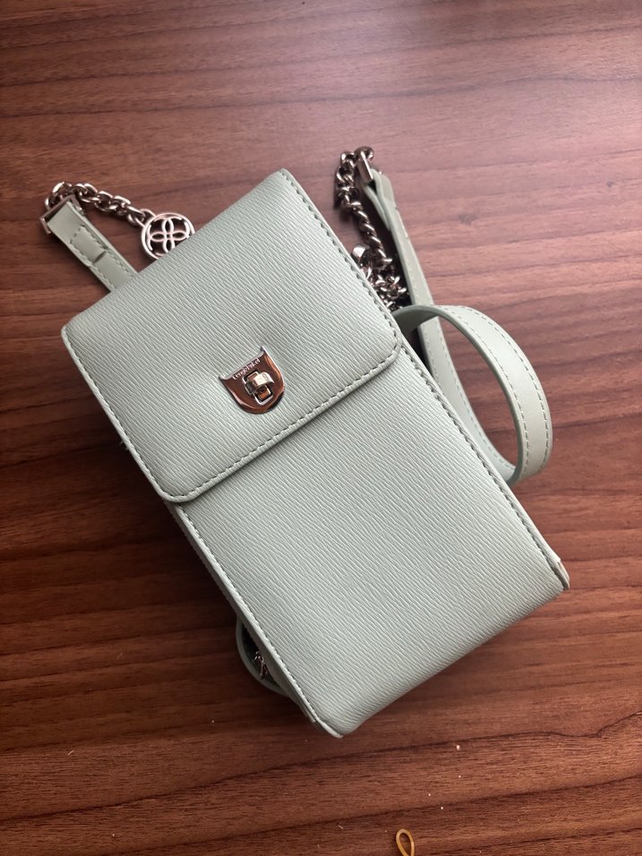 Tokalı kapaklı, zincir askılı gri deri kadın çantası. Minimalist ve gündelik sokak stiline uygun. Ürün hiç kullanılmadı yeşil renktir