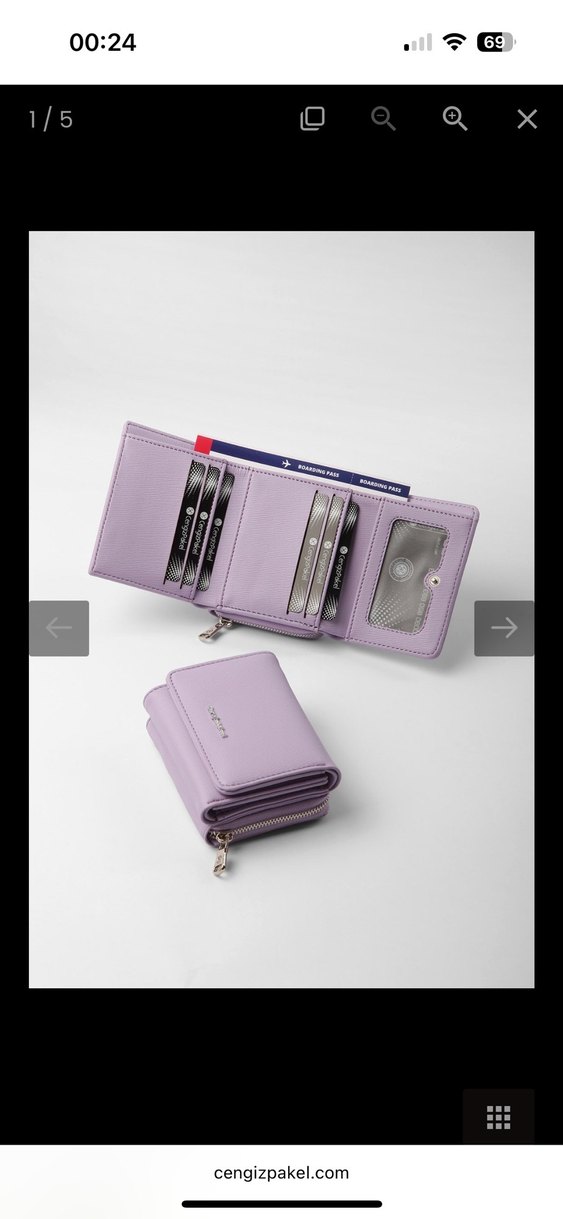 Pastel mor deri kadın cüzdanı, fermuarlı kapanış ve kart ile kimlik bölmeleri içerir. Günlük iş kullanımı için çağdaş tarzda, baskılı desenlidir. Kullanımdan dolayı deformasyon vardır