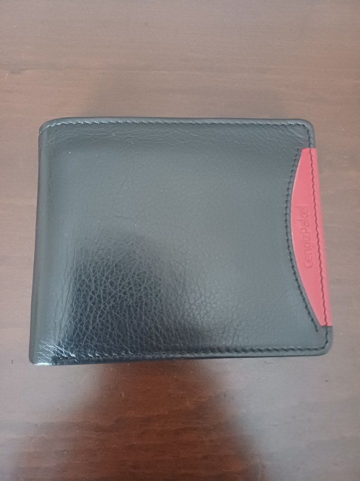 Siyah, deri erkek cüzdanı, pürüzsüz yüzey ve ince kırmızı detay ile modern ve trend tarzda.