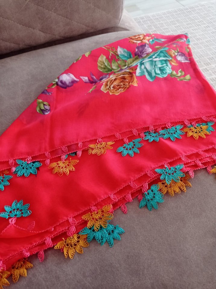 Çiçek desenli, dantel detaylı renkli bohem kadın fuları, tekstil malzemeden üretilmiştir.