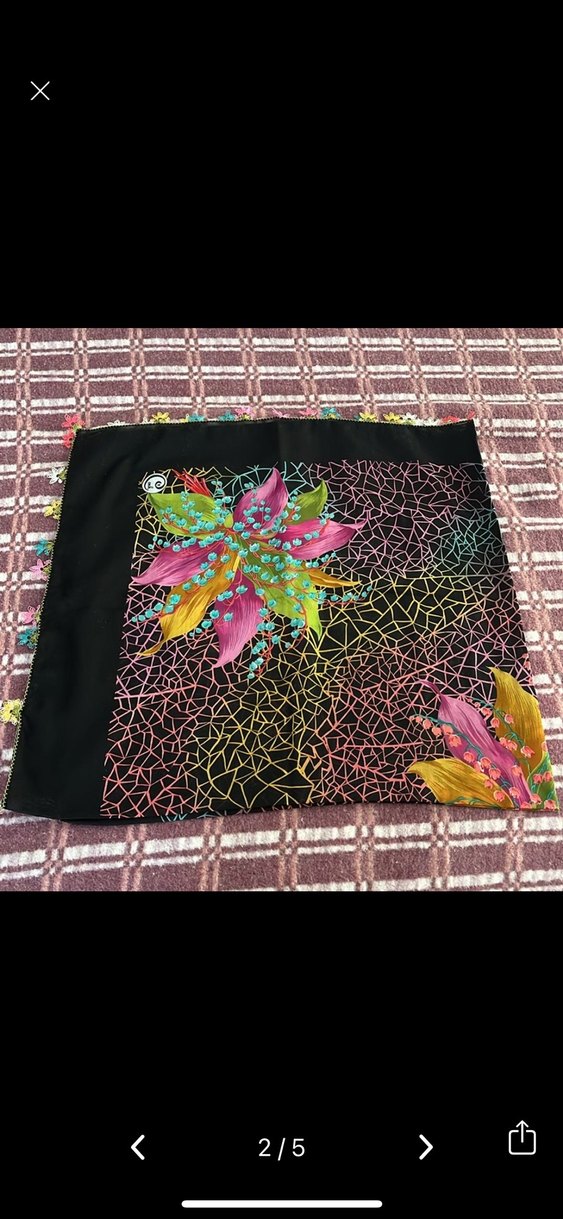 Kadınlar için koyu renkli, çok renkli çiçek desenli ve dantel detaylı, bohem ve retro tarzda sentetik kumaştan fular.