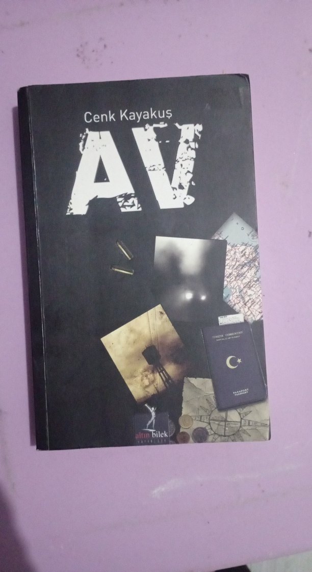 Cenk Kayakuş'un Av adlı romanı, güçlü bir anlatımla yoğun temaları işliyor. Kapakta mermi ve harita gibi sembolik görseller yer alıyor.