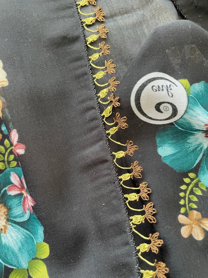 Bohem tarzda, gri zemin üzerinde çok renkli çiçek desenli ve düğmeli kadın şalıdır.