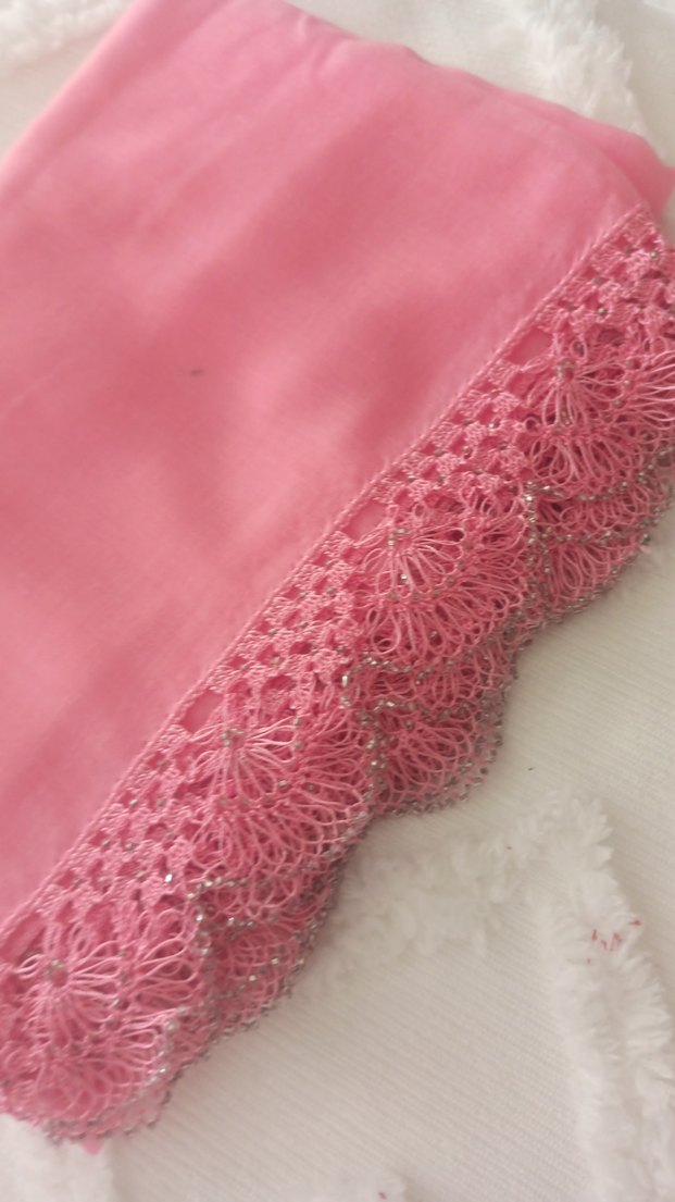 İpek gibi pembe fular, parlak dantel detaylıdır. Bohem tarzda, nostaljik ve göz alıcı bir şıklık sunar.