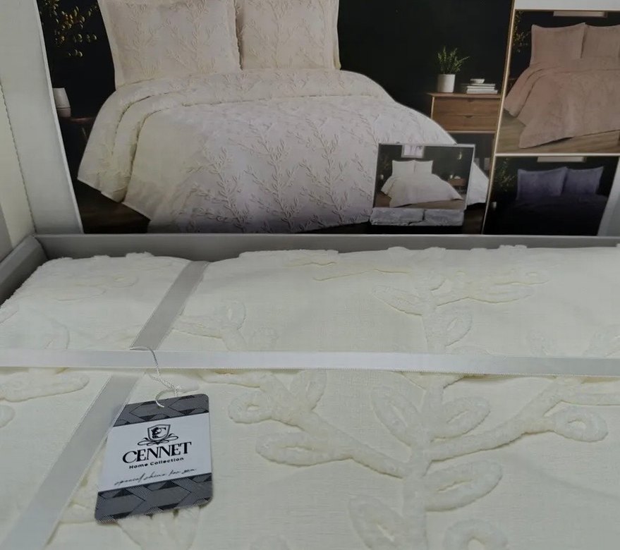 Beyaz renkli, hafif baskılı desenli nevresim ve çarşaf takımı, yumuşak dokulu ve Cennet markalıdır.