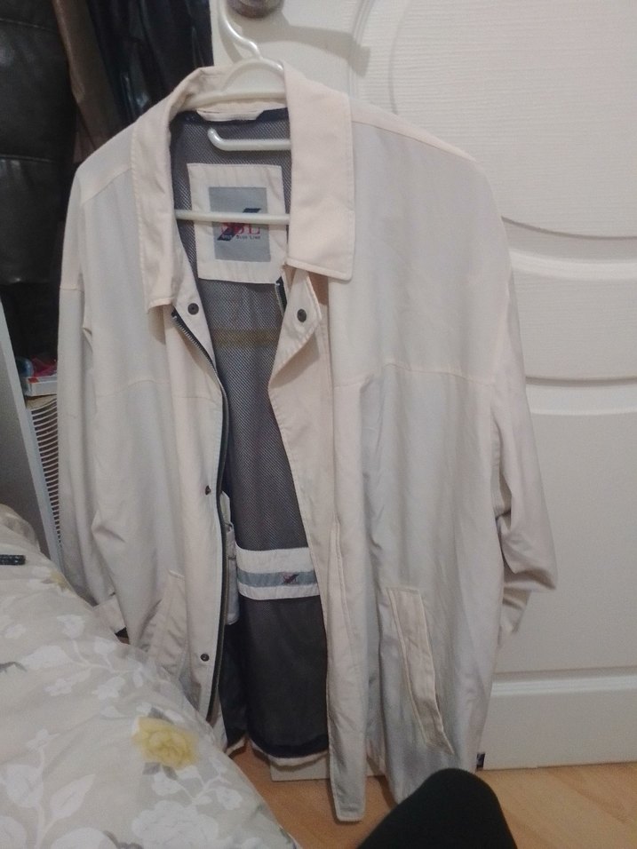 Beyaz renkte, notalı yaka ve uzun kollu, bol kesimli kadın yağmurluk Fermuarlı ve sentetik kumaştan, günlük rahat kullanım için uygun.