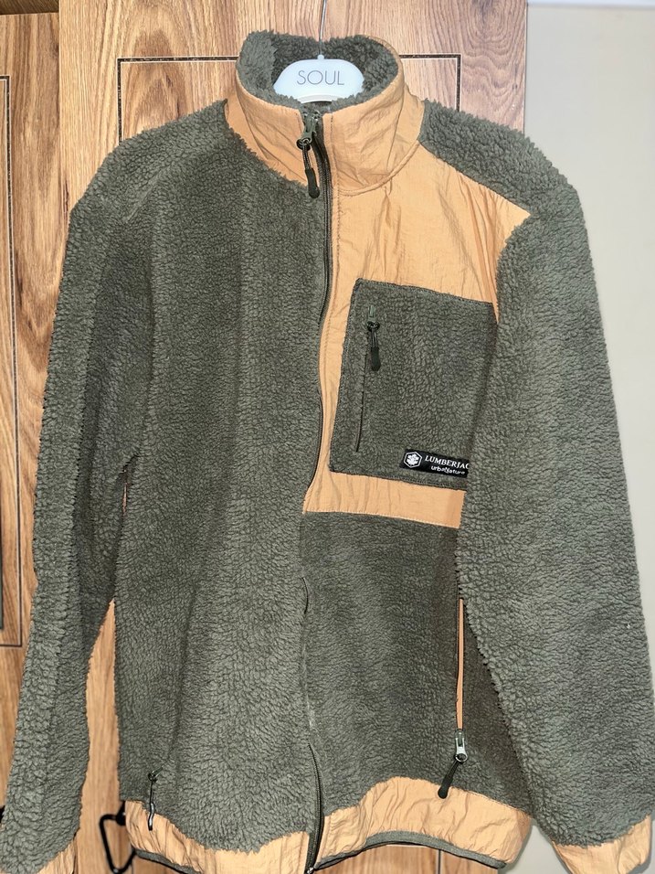 Yüksek yakalı, yeşil ve kahverengi renkli, fermuarlı ceplere sahip bol kesim polar. Yumuşak kumaşı ve desen içermeyen tasarımıyla günlük kullanıma uygundur.