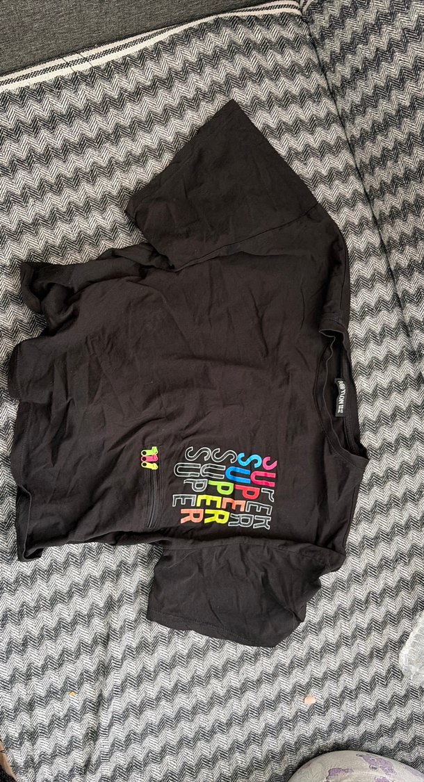 Renkli baskılı yazılı, kısa kollu, bisiklet yaka siyah hamile tişörtü. Yumuşak ve sıcak kumaştan, rahatlık için bol kesim ve fermuar detaylı.