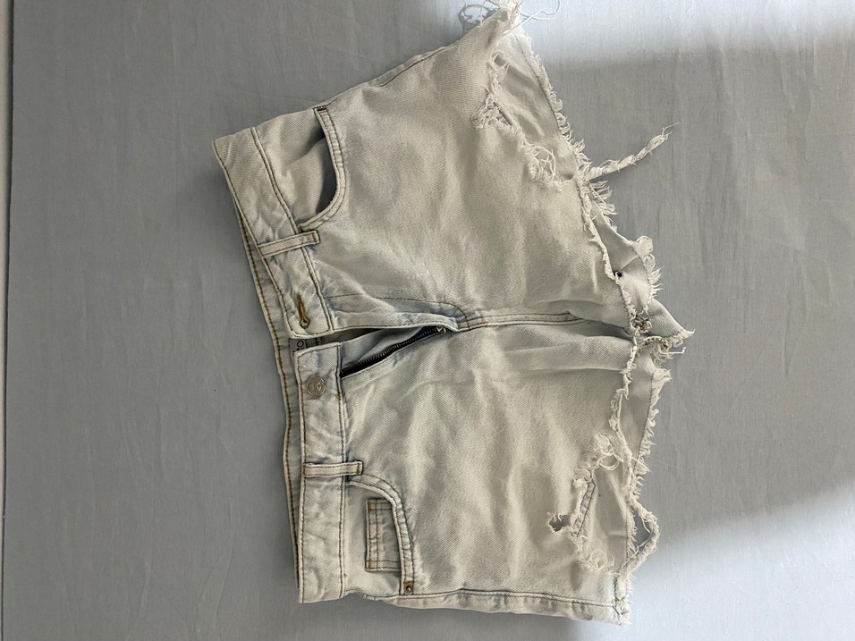 Cep fermuarlı, bol kesim bej midi jean şort, salaş sokak tarzı için tırtıklı kenarlarla. Günlük kullanıma uygun.
