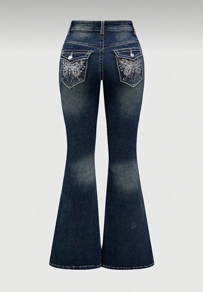 Gri tonlarında, ceplerinde kelebek detaylı, bohem tarzda kadınlara özel fitted midi boy kot pantolon.