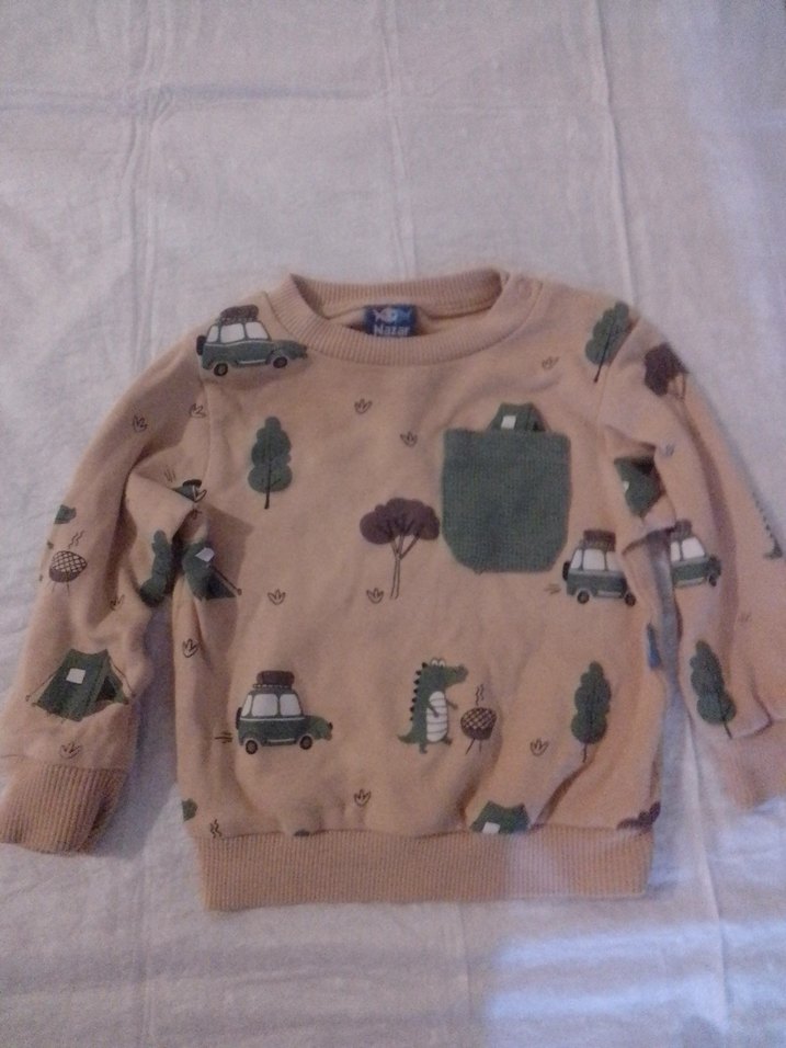 Erkek çocuk kahverengi sweatshirt, uzun kollu ve bisiklet yaka. Yumuşak ve sıcak kumaştan, örme dokulu, baskılı araba ve ağaç desenli. Önünde küçük cep bulunur.