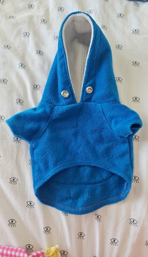 Kapüşonlu ve yumuşak dokulu mavi kedi köpek sweatshirtü. Renkli sokak stili ve desensiz tasarıma sahip. Bedeni XS'dir. 2-3 kiloya kadar olur.