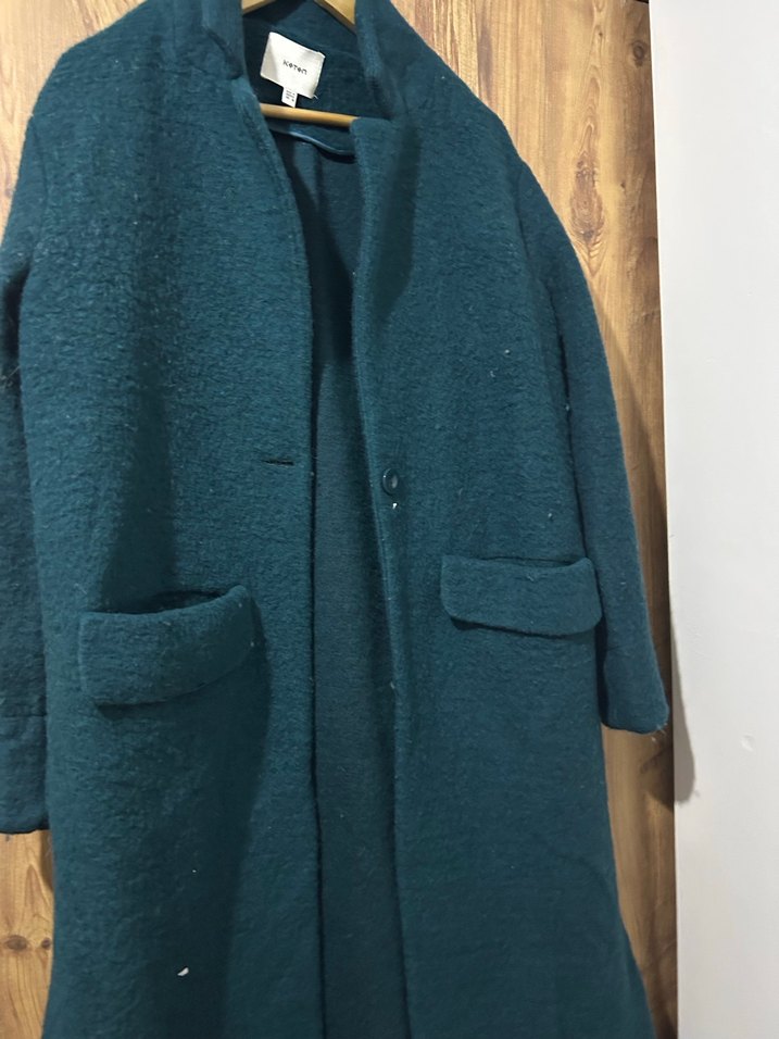 Cepleri ve yumuşak dokulu kumaşı olan uzun koyu yeşil kaban. Soğuk havalar için sade ve şık bir tasarıma sahiptir.