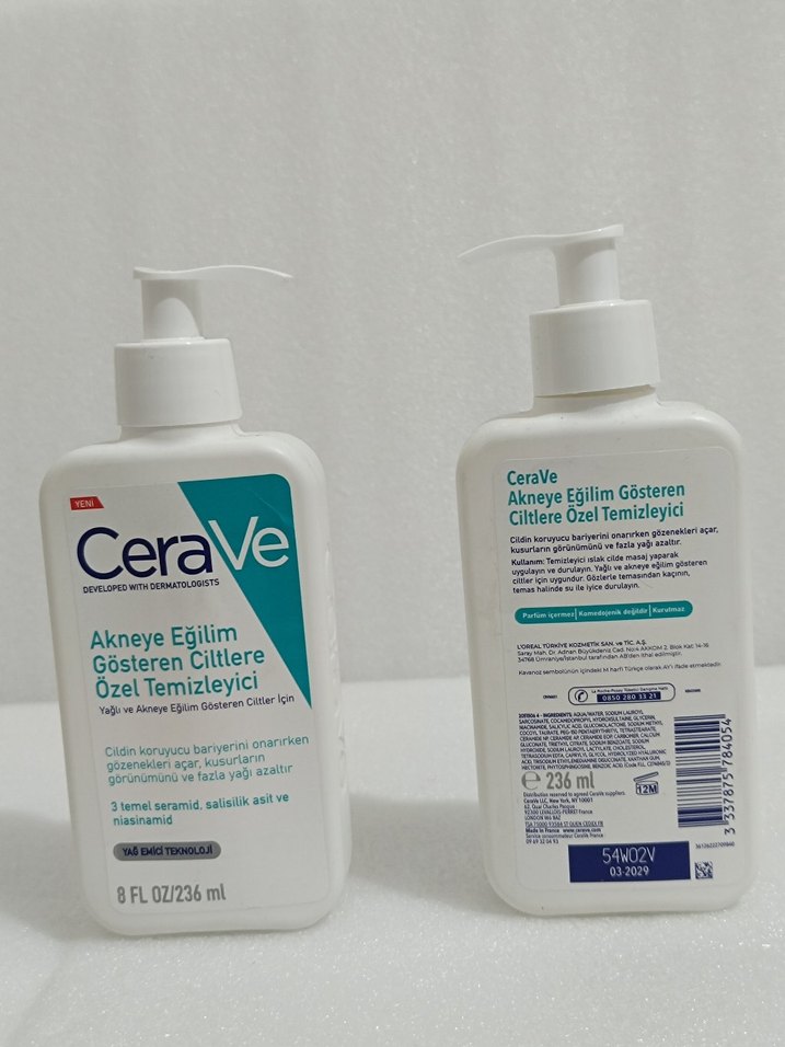 CeraVe, akneye eğilim gösteren ciltler için özel temizleyici. Cilt bariyerini onarır, yağlanmayı ve kusurları azaltır. 3 temel seramid, salisilik asit ve niasinamid içerir.