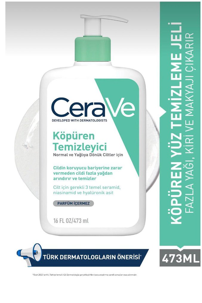CeraVe köpüren yüz temizleme jeli, fazla yağ, kir ve makyajı cildi koruyarak nazikçe arındırır. Seramid, niasinamid ve hyaluronik asit içerir. Parfümsüz, dermatolog onaylı.