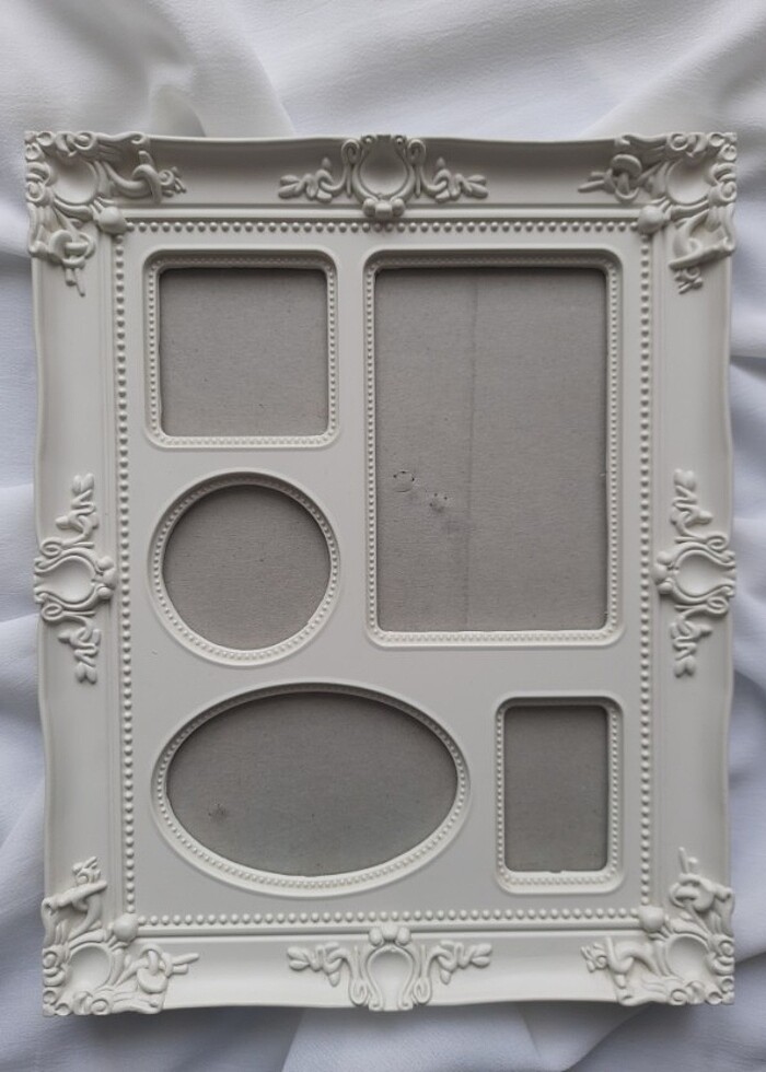 Beyaz, kabartma motifli, ayaklı, 5'li dekoratif çerçeve. En:26 cm, boy:32 cm
