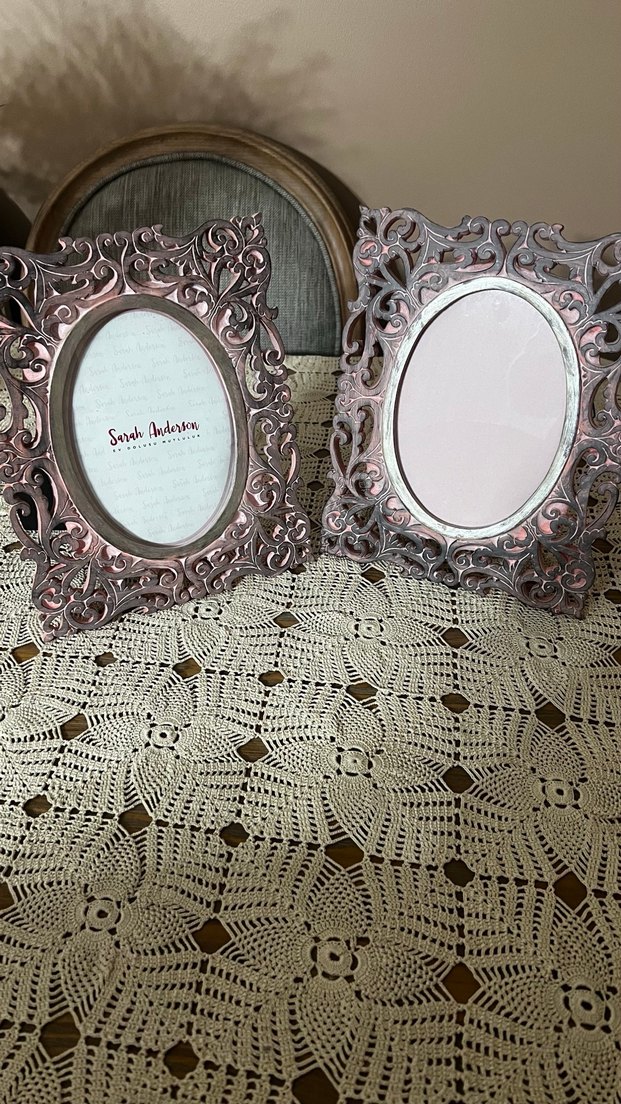 pembe renkte, detaylı süslemelere sahip dekoratif çerçeveler. Fotoğraf veya sanat eserleri için uygundur. ️Karaca marka sıfır kutulu 2 adet çerçeve pembe eskitmeli