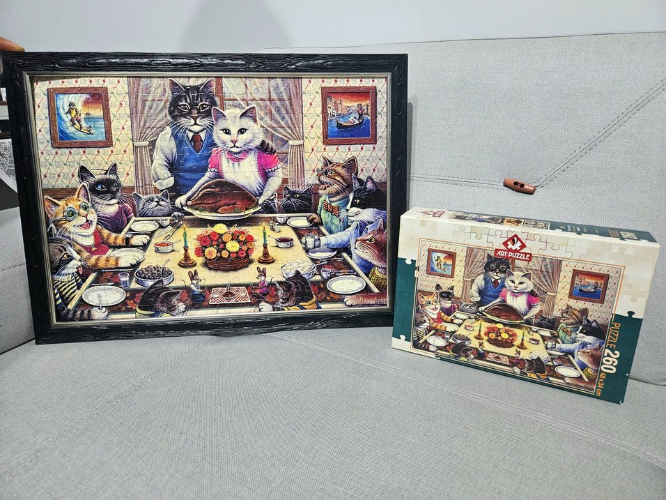 260 parca kedi ailesi aksam yemegi puzzle.Tablo D&R dan alınmıştır. Hicbir kusuru yoktur duvara asmaya hazir haldedir.