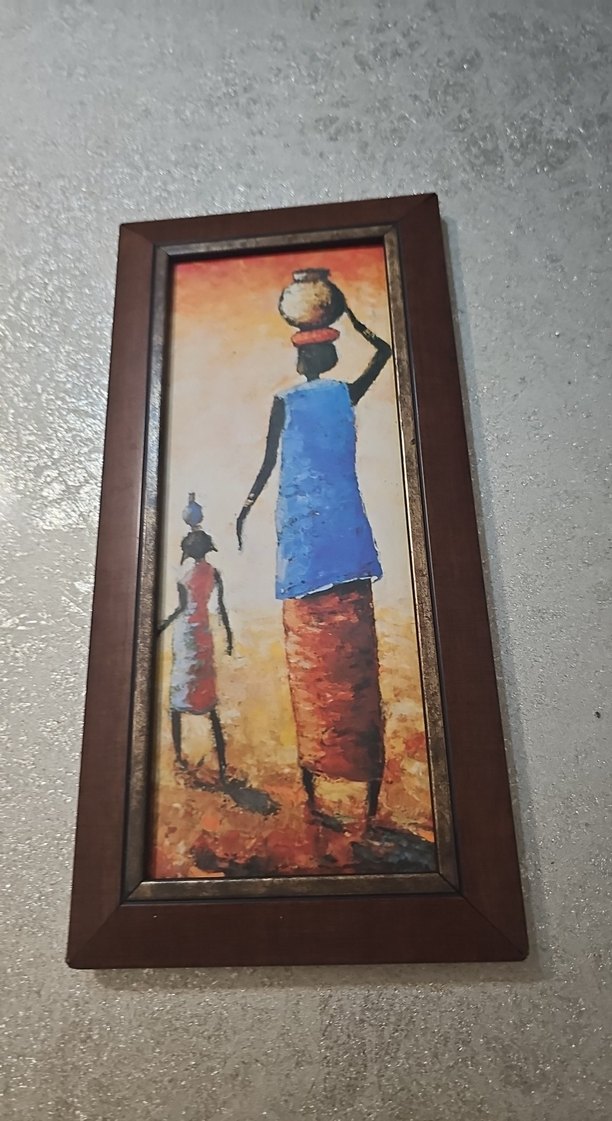 Çerçeveli bu tabloda, geleneksel kıyafetli iki figür yer alıyor, biri başında bir çömlek taşıyor. Canlı ve koyu renkler kullanılmış. ️
