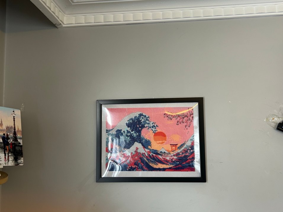 Çerçeveli, koyu renk tonlarında çok renkli dalga manzarası ve batmakta olan güneş figürü.
