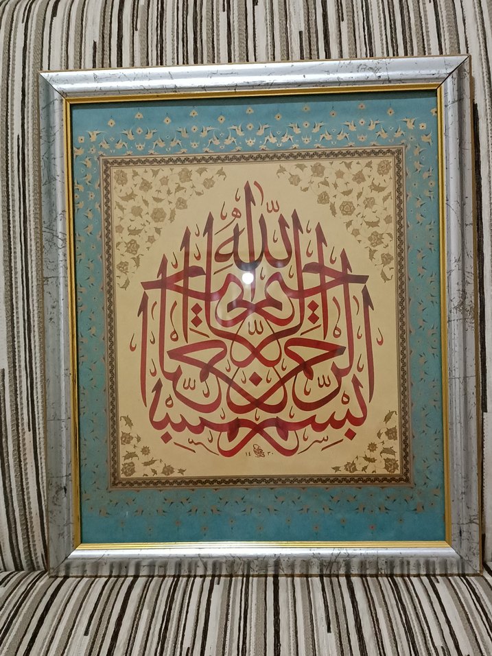 Çerçeveli tablo, çok renkli ve açık tonlarda detaylı İslami hat sanatı içerir. Geleneksel sanatla zarif renkler bir arada.