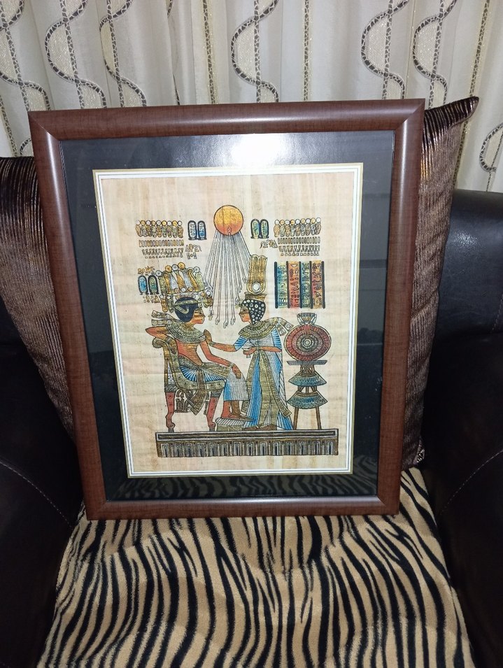 Ahşap çerçevede, koyu tonlarda çok renkli antik Mısır figürleri ve simgeleri içeren tablo.ölçileri 46&55 cm